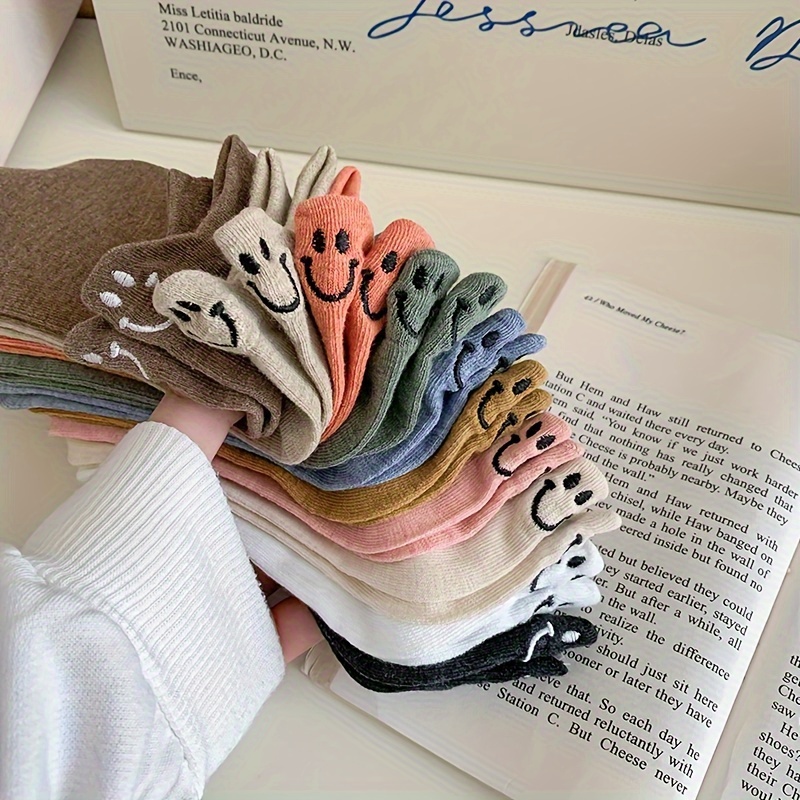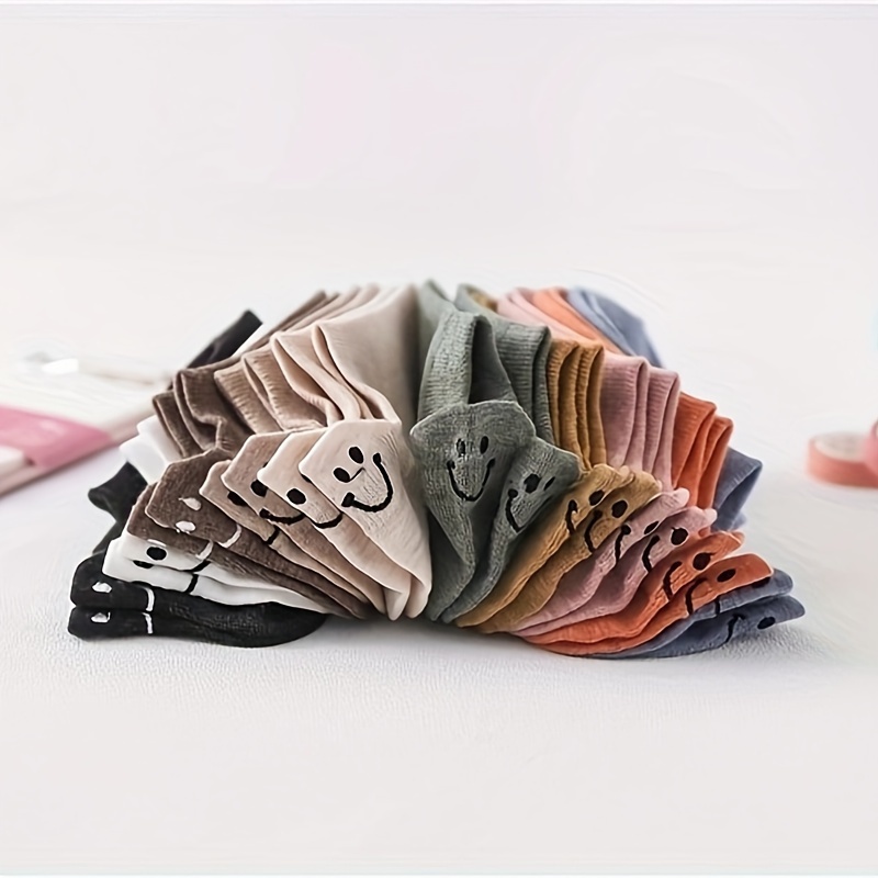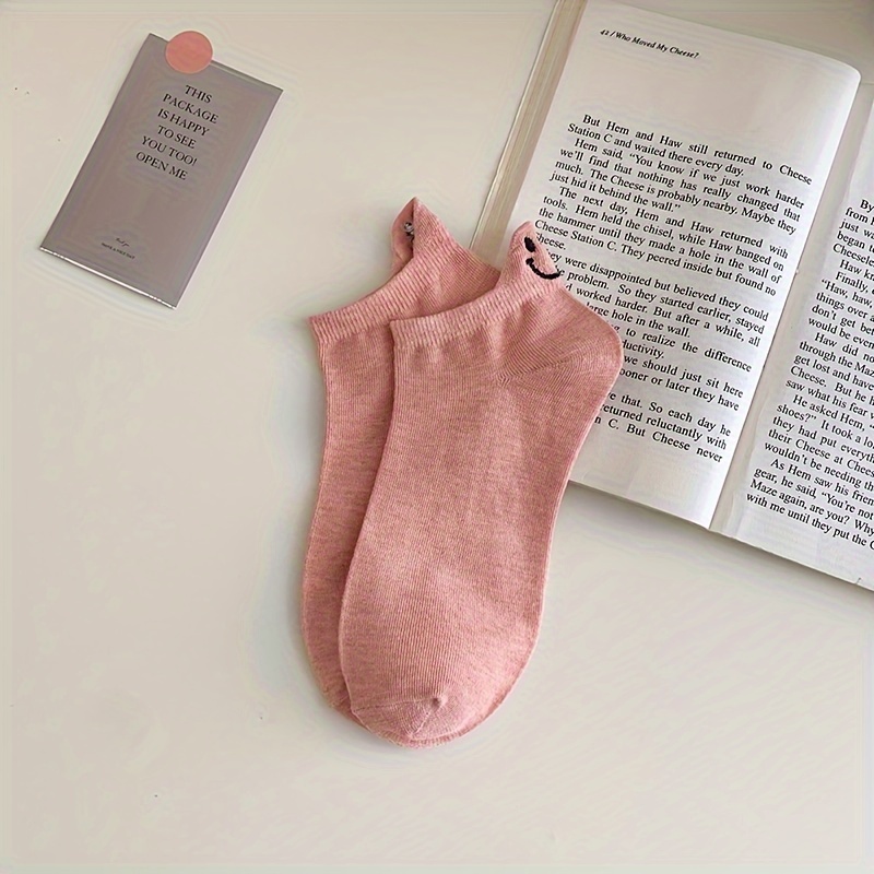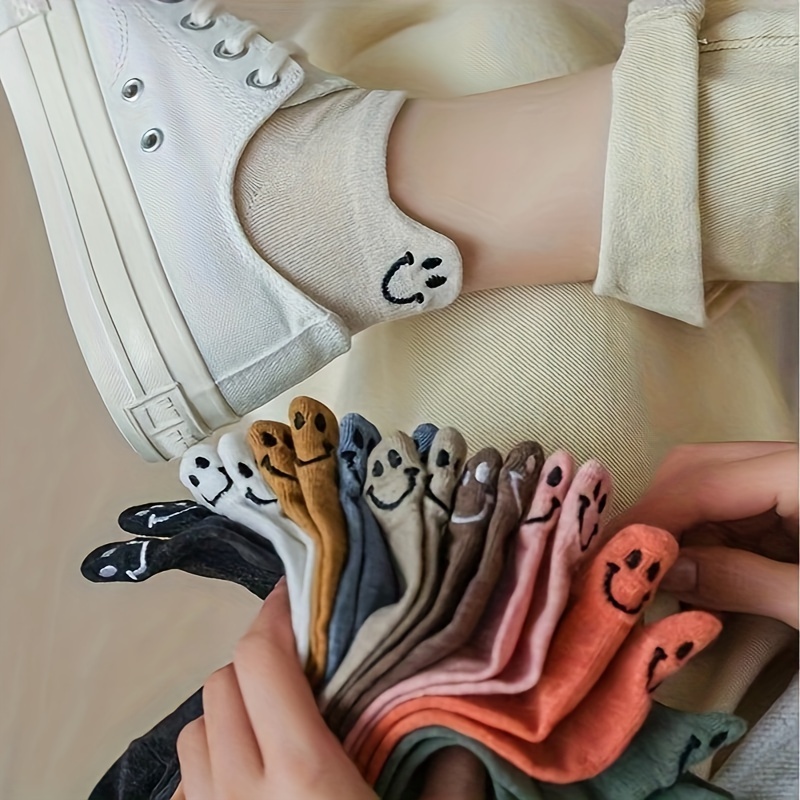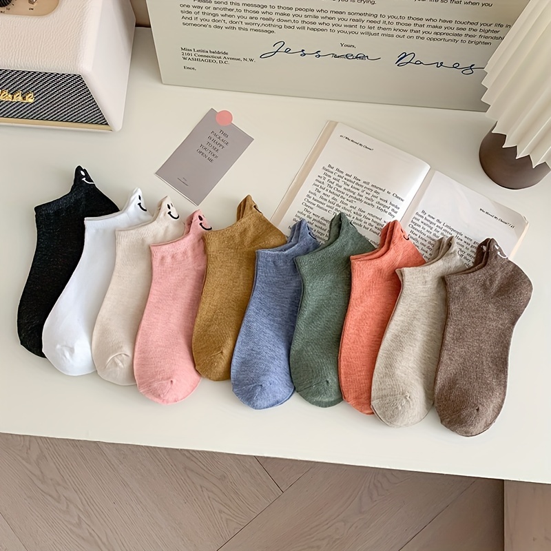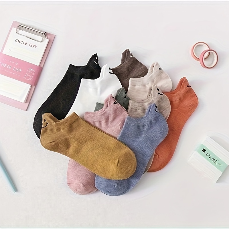 10 Pairs Of Stylish Happy Smile Face Embroidery No Show Socks Lightweight Breathable & Comfortable One Size For Women Lady Girls Daily Hiking Sports Socks