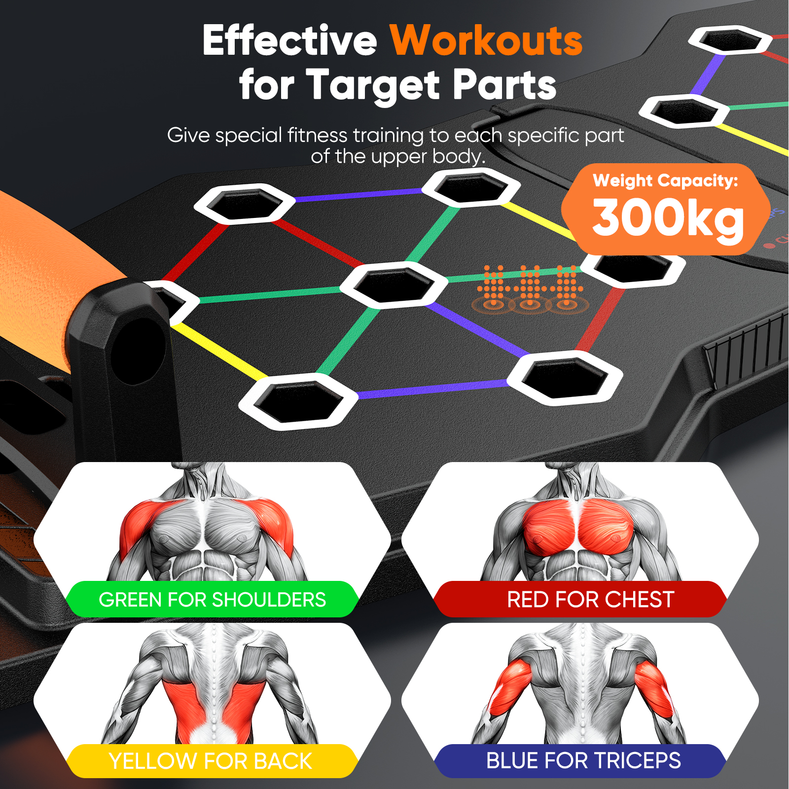 – . A more focused and effective push up training system is color-coded to bring up to 13 positions.